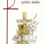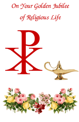 In the one card: May Our Lord's richest blessings fill this Golden Jubilee with every happiness. Qotation: Rejoice and be exceeding glad Matt 5:12. In the other card: May Our Lord's richest blessings and graces fill this Golden Jubilee with every happiness. Congratulations. Quotation: I confirm my consecration to you for life, for death and for eternity. (John XXIII)
